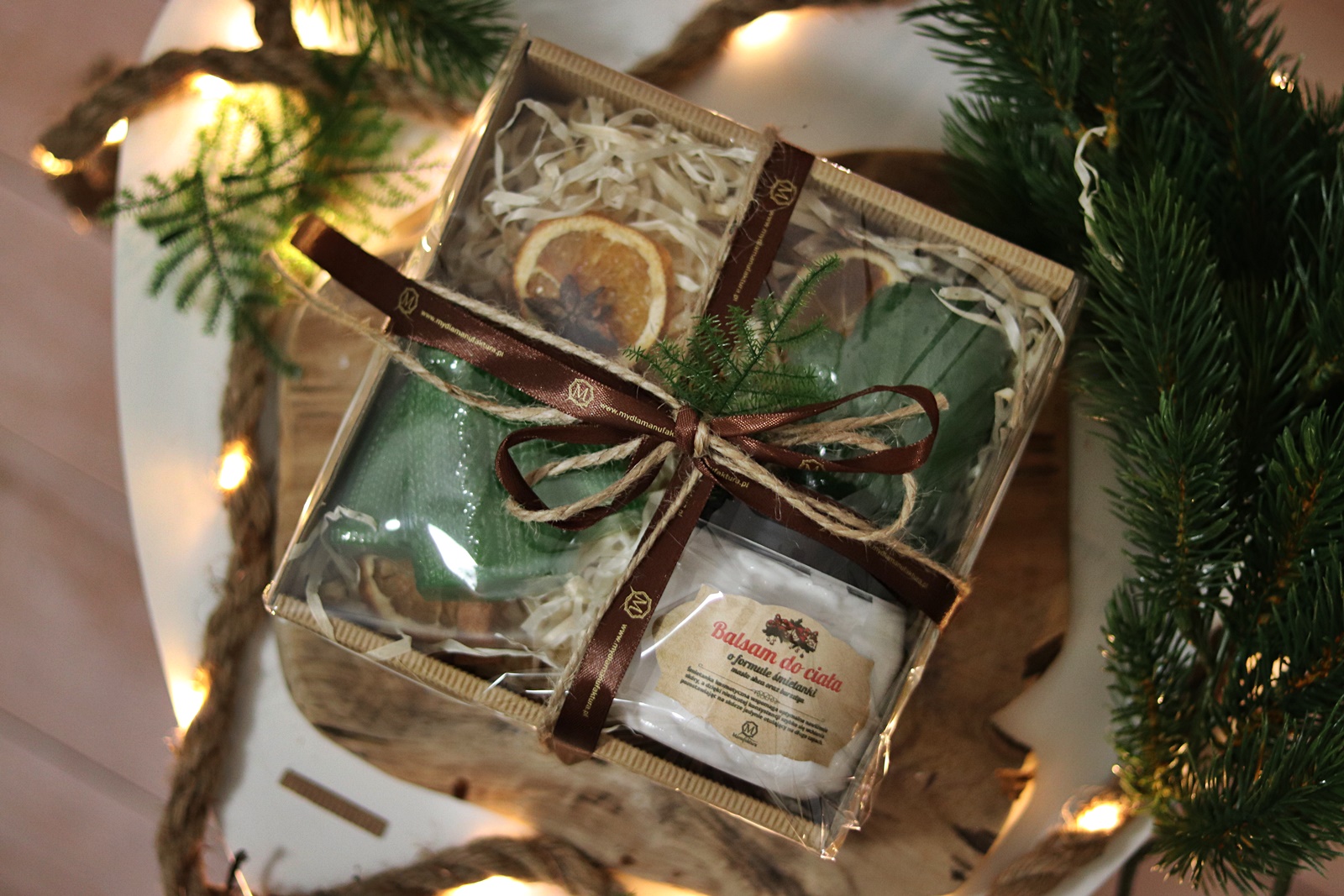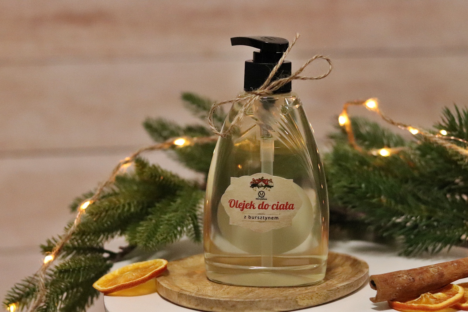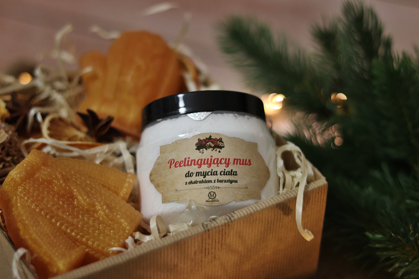 Zawartość: wybrany kosmetyk (bursztynowy balsam, olejek lub mus do mycia ciała) i dwa mydełka świąteczne